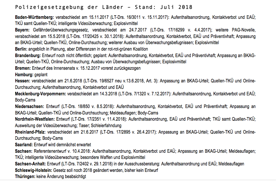 Derzeit erleben wir eine neue Welle. Fünf Bundesländer haben bereits Änderungen ihrer Polizeigesetze verabschiedet, in vier Bundesländern liegen Entwürfe vor. In Bremen wurde ein Entwurf vorerst zurückgezogen. In den meisten anderen Ländern sind Vorlagen angekündigt oder geplant (zur Übersicht). Teils handelt es sich wie in Bayern um umfassende Novellierungen, teils „nur“ um die vom Bundesinnenministerium „dringlich“ geforderten Maßnahmen gegen „GefährderInnen“.
