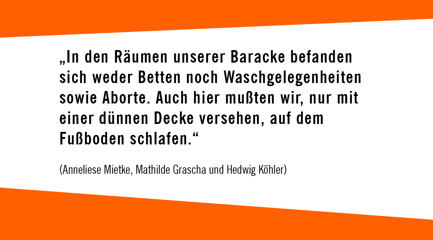 Über die Bedingungen im Lager berichten Anneliese Mietke, Mathilde Grascha und Hedwig Köhler. Die drei Frauen kamen aus dem Außenlager »Universelle« nach den Luftangriffen im Februar 1945 auf Dresden und waren zwischenzeitlich in Mockethal/Zatzschke interniert. In ihrem Bericht heißt es: