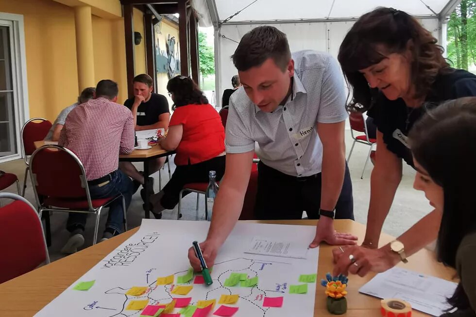 Romy: Ich hatte zu dieser Veranstaltung in Rauden zur Gründung eines Gewerbe- und Tourismusvereins aufgerufen auch mit dem Hintergedanken, die 18 Ortsteile zu einen und zumindest im Bereich Gewerbe und Tourismus voranzubringen. Von den 30 - 40 Leuten der ersten Runde sind dann noch 5 - 8 über einen längeren Zeitraum gekommen. Wir haben uns regelmäßig getroffen und gesprochen, was wir alles so machen können. Wir haben Seiten voll geschrieben, was alles gut wäre zu machen, sind aber nicht vorangekommen. Noch nicht einmal aus dem Grund, dass wir es nicht hätten tun können. Irgendwie hatten wir die Handbremse gezogen und haben uns dann externe Hilfe geholt. Die hat uns dann tatsächlich auf den richtigen Weg gebracht.