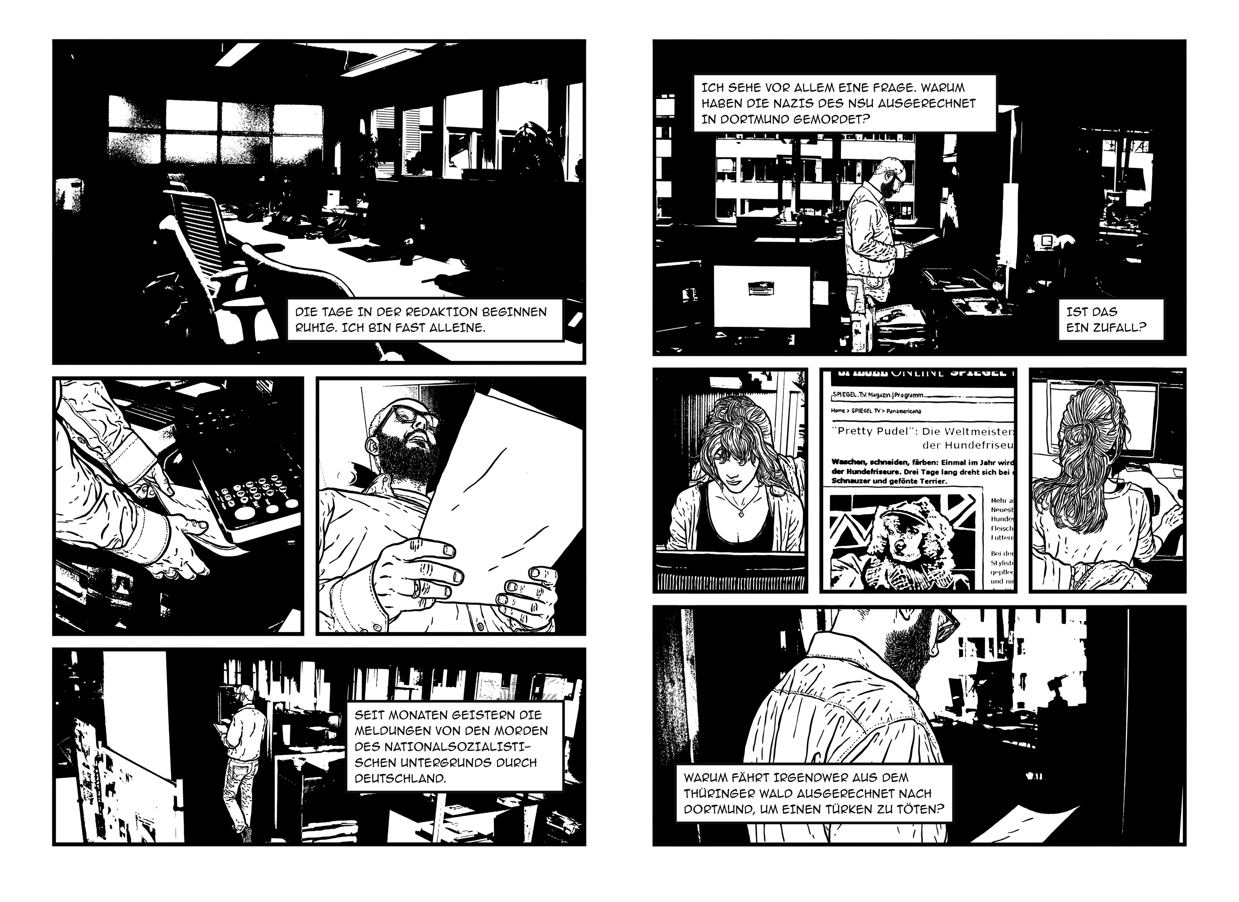 Die Stadt Dortmund tief im Ruhrgebiet hat eine der vitalsten Neonazi-Szenen Deutschlands. Gewalttäter haben hier Familien aus ihren Häusern vertrieben. Sie haben im Laufe der Jahre mehrere Menschen umgebracht. Heute ziehen sie mit Fackeln vor Flüchtlingsheime und schicken Journalisten Todesanzeigen. In der grafischen Reportage „WEISSE WÖLFE“ enthüllen Autor David Schraven und Zeichner Jan Feindt ihre Ideologie. Und zeigen: Es sind regionale Gruppierungen wie jene in Dortmund, die Anschläge nach Art des Nationalsozialistischen Untergrundes (NSU) erst möglich machen.