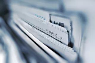 Zoom auf Zeitungen. Im Fokus ist eine Seite mit der Rubrik "classified".
