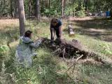 Tanja Sanders (rechts im Bild) und Grit Ebert bei der Betrachtung des Wurzelgeflechts einer Douglasie und des extrem sandigen Bodens.